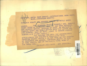 London Countess Beatty formerly Mrs Dorothy Power Sands of Virginia who it is reported may succeed Marrina Duchess of Kent as Britain's fashion queen and style setter when the latter and her husband Duke of Kent leaveto become distant Australia's First family The Duchess has been the acknowledged style leader for England's femininitywith Countess Beatty having slight edge on Duchess of Roxburghe for 2nd Countess Beatty is wie of Earl Beatty son of Britain's naval hero of world war
