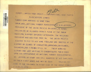 Omaha Nebraska National rubber administrator WR Jeffers president of Union Pacific Railroad is shown smiling as he alighted from a plane at the Omaha municipal airport The railroad president who can ride free on his trains elected to fly to his home town and was greeted at airports by scores of conductors, brakemen, switchmen, engineers and firemen still in their working clothes and just waiting to congratulate their boss upon his appointment as National rubber administrator Mr Jeffers no doubt van call hundreds of his employees by their first names and may be seen talking to some of the trainmen on right side of the combo