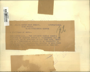 Washington DC Intimate candid camera shots of Senator Arthur H Vandenberg of Michigan as he appeared in his home here working on a speech to be presented in the Senate The 52 year old Senator is mentioned as possible GOP Presidential nominee