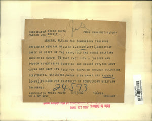 Brigadier General William E. Shedd (left) assistant chief of staff of the army told the House Military Committee August 13 that even with a "bigger and louder advertising campaign and higher pay, the Army could not meet its need for manpower through voluntary enlistments. General Shedd, shown with chairman A. J. May (D-Ky), pleaded for enactment of compulsory military training.