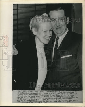Dr Dale Alford an outspoken segregationist hugs his wife and proclaims himself victor over Democratic Congressman Brooks Hays of Little Rock. Alford blasted Hays moderate stand on the integration question and ran as a last minute write in candidate against the veteran of 16 years in Congress. Alford is a life long Democrat but had run as an Independent since he did not take part in a primary.