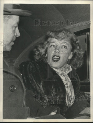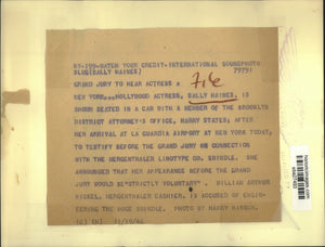 NY Hollywood actress Sally Haines, is shown seated in a car with a member of the Brooklyn District Attorney's office Harry States, after her arrival at La Guardia airport to testify before Grand Jury in connection with the Mergenthaler Linotype Co swindle. She announced that her appearance before Grand Jury would be strictly voluntary. William Arthur Nickel, Mergenthaler cashier, is accused of engineering the huge swindle