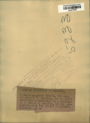 Wash Dc Hugh Gibson, the US ambassador to Belgium, who is being mentioned prominently as a successor to Myron T Herrick, as the ambassador from US to Frace.