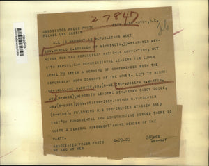 Gov Harold E Stassen of Minnesota, 33 year old keynoter for Republican National Convention with the GOP high command of the House. Left to right Sen Wallace H White Jr R of ME, Rep Joseph W martin Jr R of Mass, minority leader, Sen Henry Cabot Lodge Jr R of Mass, Gov Stassen, Sen Arthur H Vandenber R of Mich. Following his conferences Stassen said that On fundamental and constructive issues there is quite a general agreement among members of the party.