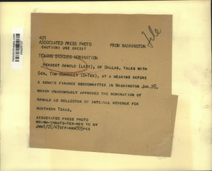 Herbert Arnold at left of Dallas talks with Sen Tom Connally D of Tex at a hearing before a Senate finance sub committee in Washington Jan 28, which unanimously approved the nomination of Arnold as collector on Internal Revenue for Northern Texas