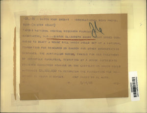 Sister Elizabeth Kenny today urged Congress to enact a House bill which would set up a National Foundation for Research on Cancer and other degenerative diseases. The Australian nurse, famous for her treatment of infantile paralysis, testified at a House Interstate Commerce Committee hearing on the legislation which would authorize $5,000,000 to establish the Foundation for Research in Major Diseases.