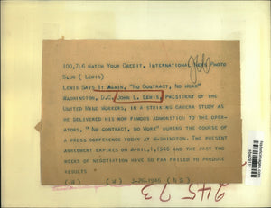 UMW Pres. John Lewis during press conference about United Mine Workers' new labor contract.