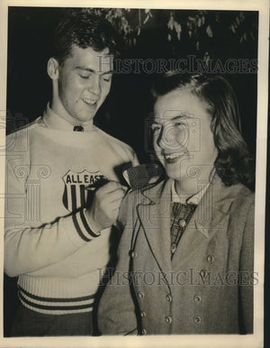 1941 Press Photo Harvard guard Endicot Peabody signs autograph for Dora Pickich