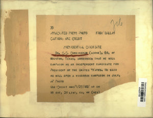 1948 Press Photo Dr. C.C Cunningham runs as independent candidate for president