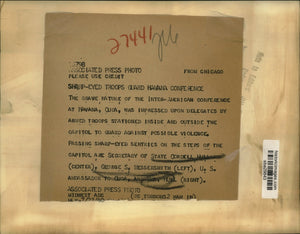The grave nature of the Inter-American Conference at Havana, Cuba, was impressed upon delegates by armed troops stationed inside and outside the capitol to guard against possible violence. Passing sharp eyed sentries on the steps are Secretary of State Cordell Hull, George S Messersmith US Ambassador to Cuba and Mrs Hull.