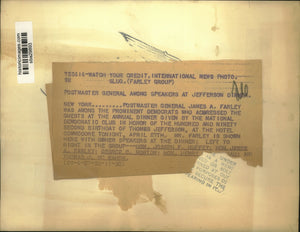 NY Postmaster General James A Farley was among the prominent Democrats who addresses guest at the annual dinner given by National Democratic Club in honor of 192nd birthday of Thomas Jefferson, at the Hotel Commodore tonight April 27th. Mrs Farley is shown with other speakers at the dinner L to R Hon Joseph F Guffey, Hon James A Farley, George C Norton, Hon Henry and Thomas J McMahon.