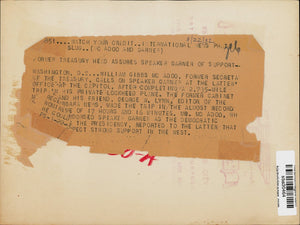 Washington, D.C.: William Gibbs McAdoo, former Secretary of the Treasury, calls on Speaker Garner at the latter's office at the Capitol, after completing a 2,735-mile trip in his private Lockheed plane. The former cabinet member and his friend, George W. Lynn, editor of the...bara News, made the trip in the almost record...of 17 hours and 16 minutes. Mr. McAdoo, wh...endorsed Speaker Garner as the Democratic...the Presidency, reported to the later that he could expect strong support in the west.