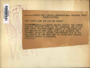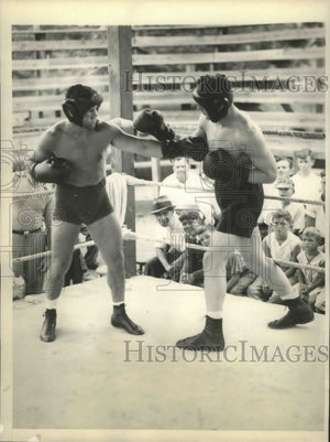 Mickey Walker sparing with big Ted Sandwina one of his many hefty sparring mates. Mickey is preparing fir his meeting with Jack Sharkey the Silent Sailor of Boston