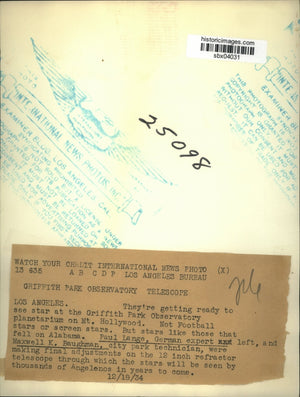 1934 Press Photo Paul Lange, Maxwell K. Baughman Griffith Park Observatory