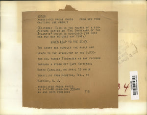 The angry sea hurdles the rails and leaps to the stack-top of the 8,000-ton oil tanker tidewater as she ploughs through a storm off Cape Hatteras, North Carolina, on April 13 while traveling from Houston, Texas to Bayonee, N.J.