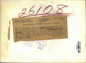 Olympe Bradna film actress is pictured with her fiance, Douglas Wood Wilhoit as they announced their intentions to wed. The young couple will be married May 14th, unless the bride-to-be's picture schedule necessitates a change of date in the church of the Good Shepherd in Beverly Hills.