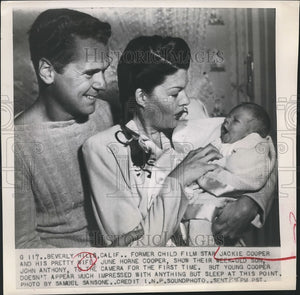 Beverly Hills CA, Former child star Jackie Cooper and his pretty wife, June Horne Cooper, show their week old son, John Anthony, to the camera for the first time. But young cooper doesn't appear much impressed with anything but sleep at this point.