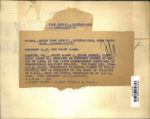 Chief G-Man J. Edgar Hoover (left) received an Honorary Degree of Doctors of Laws at the 115th Commencement Exercise of Pennsylvania Military College. The Right Rev. Francis M. Taitt, Protestant Episcopal Bishop of Philadelphia who is President of the Board of Trustees of P.M.C. Made the formal presentation of the Degree. That ceremony is illustrated.