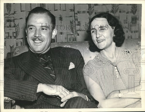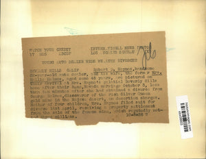 Robert D Haynes, handsome 32-year old auto dealer, and his wife, the former Mrs Hallie Holmes, aged some 45 years, are pictured on their arrival at Mrs Hayne's palatial Beverly Hills home after their Reno, Nevada marriage October 3, less than ten minutes after she had obtained a divorce from George Holmes, discoverer of the rich Silver Queen gold mine in the Mojavo Desert, on desertion sharges. Mother of four children, Mrs Haynes filed suit for divorce last April, receiving a property settlement form the sale of the famous mine, which reputedly netted three million.