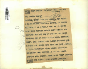 Emmet "Red" Ormsby, for years a major league baseball umpire, is shown nationally as a family man. He is shown here when recruit sailor Emmet Ormsby - In uniform - Met his family during the first visiting day at Great Lakes Naval Station. "Red", Mrs Ormsby and eleven brothers and sisters are shwon here with the blue jacket. L to R - Dorothea - Rita - Helen - Delores - Rosemary - Ban. Sitting, L to R - Edward - Esther - Mrs Ormsby - Emmet - Mr "Red" Ormsby - Robert and Nancy.