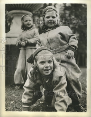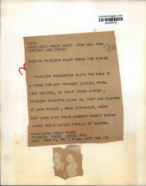 Princess Margaretha plays the role of a horse for her youngest sister, Princess Desiree, as their other sister, Princess Birgitta looks on. They are playing at Haga Palace, near Stockholm, where they live with their parents Prince Gustav Adolf and Princess Sibylla of Sweden