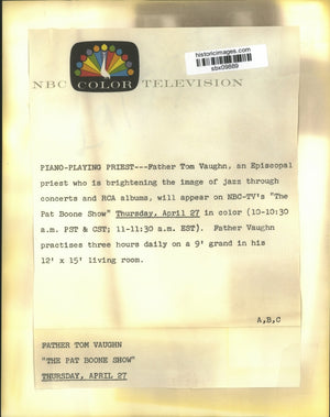 Father Tom Vaughn, an Episcopal priest who is brightening the image of jazz through concerts and RCA albums, will appear on NBC-TV's "The Pat Boone Show" in color. Father Vaughn practices three hours daily on a 9' grand in his 12' x 15' living room.