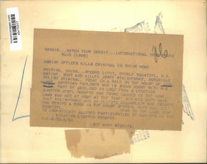 Second Lt. Dewolf Schatzel U.S. Marine shot and killed Joseph Staishfwsky notorious Polish Criminal. Today in a raid on the House of Gene Lamb, American Explorer who is shown above with his wife part of $500.00 in loot from legation quarters Jewel Robbery was found cached in the home. Lamb was not at home at the time, but his wife said that Staishewsky and alleged accomplice who escaped had rented a room in the house several days ago. Lt. Schatzel went to the Lamb home to investigate alleged participation of Marines in the Legation Quarter Robbery.