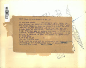The much publicized Russian Steamroller did some plain and fancy rolling. Russian Forces claimed to have captured 20,000 Officers and men of the Austro-German Army at Sandomifz. Northeast of Cracow which recently in Poland and now is in greater action. A battery artillery played a big part in the action. A battery of the Artillery is shown.