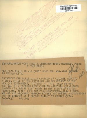 A closeup of Colonel Roberto Fierro, chief of the civilian air department of the Mexican government, pictured at this field on his arrival this morning from Curtiss Airport. Col Fierro landed at Curtiss Airport last night in his Lockheed Sirius monoplane after a flight from Montgomery, Ala. Fierro and his mechanic Arnulfo Cortez are making preparation for an attempt at a record flight to Mexico City.