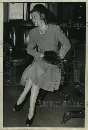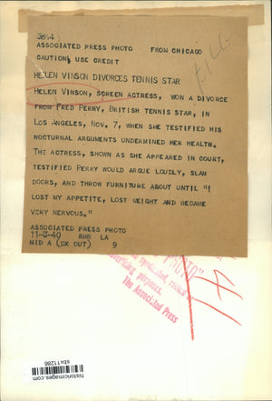 Helen Vinson, screen actress, won a divorce from Fred Perry, British tennis star, in Los Angeles, Nov 7, when she testified his nocturnal arguments undermined her heath. The actress, shown as she appeared in court, testified Perry would argue loudly, slam doors, and throw furniture about until "I lost my appetite, lost weight, and became very nervous."