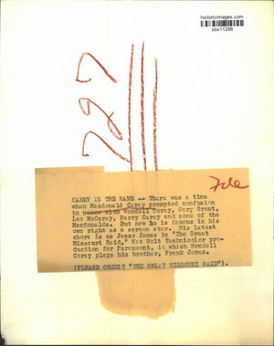 There was a time when MacDonald Carey prompted confusion in named with Wendell Carey, Cary Grant, Leo McCarey, Harry Carey and some of the MacDonalds. But now he is famous in his own right as a screen star. His latest chore is as Jesse James in "The Great Missouri Raid, Nat Holt Technicolor production for Paramount, in which Wendell Corey Plays his brother, Frank James