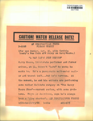 Garry More, inveterate performer and former writer, at 51, doesn't "have" to work; he wants to. He a passionate salt-water sailor and traveler buff... but he's nervous. At the moment, he and his writers are performing some rather delicate surgery on "The Garry Moore Show" -- current series, with some problems. Moore is dauntless, says he's always been a "slow starter"