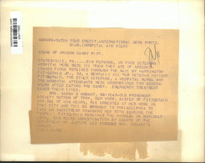 Six persons in this veterans hospital were made ill when they ate of Arsenic loaded fudge received through the mail by Harrington Fitzgerald Jr. 34 a mentally ill war veteran patient Fitzgerald two other veterans, a hospital nurse and two hospital attendants were unconscious for several hours after eating the candy. Emergency saved their lives. Mrs. Sarah O Hobart 52 year old prominent society matron of Troy New York sister of Fitzgerald and one of his heirs was arrested at her home on that City and will be brought to Philadelphia to face an indictment charging her with sending the candy. Fitzgerald received the package on November 18th Six weeks investigation by agents of the Department of Justice led to Mrs. Hobart's arrest.S