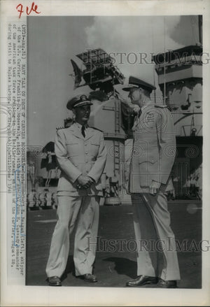 Capt Herbert E Reagan at left skipper of the carrier USS Franklin D Roosevelt chats with Rear Admiral John H Cassady commander of American task force cruising in the Mediterreanean on deck of the carrier Aug 28 during visit to Naples harbor