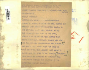 Governor-elect Edmund S Muskie of Maine and Mrs Muskie, sit proudly with their two children, Ellen, 4, and Stephen 5-1/2. Mrs Muskie, at 27 the youngest first lady in the land, confided to INS writer Olga Curtis that she's never had a servant, always has done her own cooking, housekeeping and sewing, and hopes to at least keep her hand in when she moves next January into Maine's Blaine Mansion, home of the State's Governors. This photo was supplied to International News Photos through courtesy of the Waterville (Maine) Sentinel.