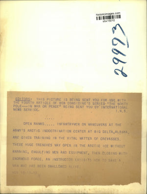 Infantrymen on maneuvers at the Army's Arctic Indoctrination Center at Big Delta, Alaska, are given training in the vital matter of crevasses. These huge trenches may open in the Arctic Ice without warming, engulfing men and equipment, then closing with enormous force. An instructor exhibits how to save a man who has been swallowed alive.
