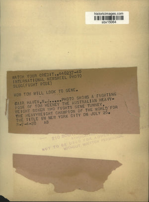 Photo shows a fighting pose of Tom Heeney, the Australian heavyweight boxer, who fights Gene Tunney, the heavyweight champ of the world for the title in NYC.