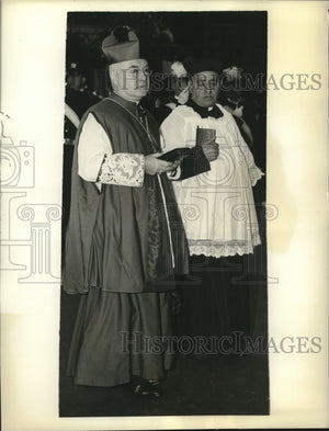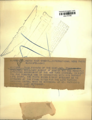 This photo of the Most Rev Francis J Spellman, Auxiliary Bishop of Boston, who was recently appointed Archbishop of the NY Diocese, is sent you for possible use in connection with his current life story. The photo shows Bishop Spellman as he appeared at the final rites for the late Patrick Cardinal Hayes, who he succeeds, at St Patrick's Cathedral last Sept.