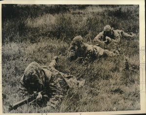 Stalking, woodcraft, and the art of camouflage are 3 of the "new" sciences of modern war now being taught the British Soldier in the preparations to resist invasion. These men, camouflaged to blend in with the terrain over which they operate, are being trained as scouts and snipers.