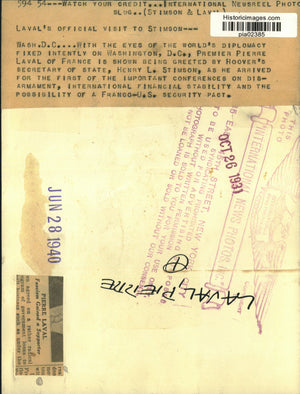 Laval, Pierre. Washington, D.C. With the eyes of the world's diplomacy fixed intently on Washington, D.C., Premier Pierre Laval of France is shown being greeted by Hoover's Secretary of State, Henry L. Stimson, as he arrived for the first of the important conferences on disarmament, international financial stability and the possibility of a Franco-United States security pact.
