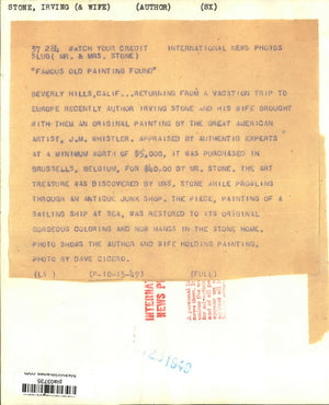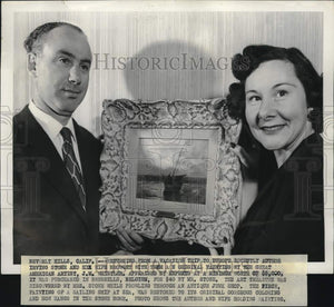 Stone, Irving (and wife) Author: Beverly Hills, California: Returning from a vacation trip to Europe recently Author Irving Stone and his wife Brought with them an original painting by the great American artist, J.M. Whistler. Appraised by authentic experts at a minimum worth of $5,000. It was purchased in Brussels, Belgium, for $40.00 by Mr. Stone. The art treasure was discovered by Mrs. Stone while prowling through an antique junk shop. The piece, painting of a sailing ship at sea, was restored to its original gorgeous coloring and now hangs in the stone home. Photo shows the author and wife holding painting.