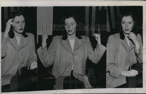 Barry, Joan. Los Angeles, California. Joan Barry is shown in three character studies as she appeared on the witness stand relating her affair with film comedian Charlie Chaplin. Center pose shows Miss Barry demonstrating how she claims Chaplin admired himself in the nude before a mirror.