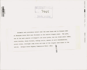Honeyman State Park, Oregon (Sand dunes). Swimmers and picnickers cavort over the sand dunes and in Cleawox Lake at Honeyman State Park near Florence on the central Oregon coast. The park, one of the most popular of Oregon's 18- state parks, has two fresh water lakes, ocean beaches, dense forests, hiking trails, masses of wild rhododendrons, picnic areas, overnight camp sites and some of the largest sand dunes in the nation.