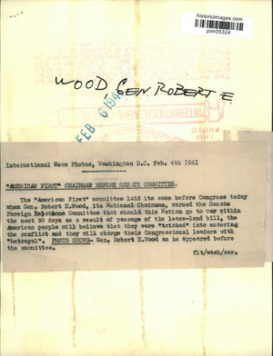 Wood, Gen. Robert E. - The "American First" committee laid its case before Congress today when General Robert E. Wood, its National Chairman, warned the Senate Foreign Relations Committee that should this Nation go to war within the next 90 days as a result of passage of the lease-lend bill, the American people will believe that they were "tricked" into entering the conflict and they will charge their Congressional leaders with "betrayal." Photo shows General Robert E. Wood as he appeared before the committee.