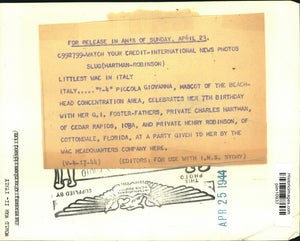 World War II - Italy. Italy. "T-4" Piccola Giovanna, Mascot of the beachhead concentration area, celebrates her 7th birthday with her Ground Infantry foster-fathers, Private Charles Hartman, of Cedar Rapids, Iowa, and Private Henry Robinson, of Cottondale, Florida, at a party given to her by the Women's Army Corps headquarters company here.