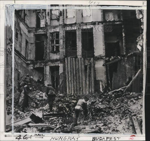 Hungary - General. Smashed during Russian attacks, workers dig into the rubble of this partially destroyed dwelling in Budapest. This picture, taken Saturday and received in London Sunday, is one of the first out of the Hungarian capital since the Soviet attack. Saturday, the puppet Hungarian government warned of a grim winter of suffering and chaos.