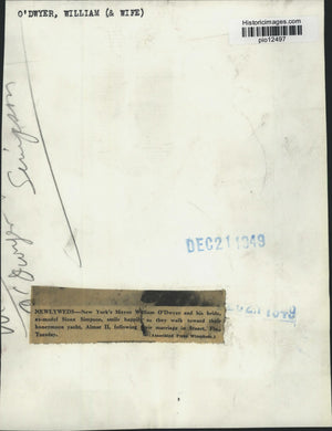 O'Dwyer, William (& wife). New York's Mayor William O'Dwyer and his bride, ex-model Sloan Simpson, smile happily as they walk toward their honeymoon yacht, Almar II, following their marriage in Stuart, Florida, Tuesday.