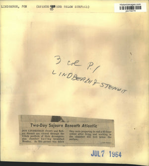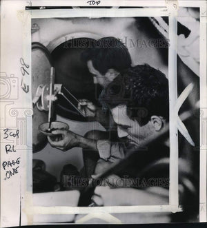 Lindbergh, Jon (Spends 95 hours below surface). Jon Lindbergh (front) and Robert Stenuit are viewed through the 4-inch porthole of their decompression chamber having breakfast Monday. As this picture was taken they were preparing to end a 95-hour ordeal after living and working in the chamber 425 feet below the surface.