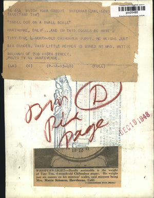 Hawthorne, California. And in this corner we have Tiny Tim, 4-month-old Chihuahua puppy. He weighs just six ounces. This little pepper is owned by Mrs. Mattie Solomon of 710 118th Street.