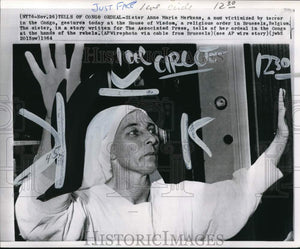 Congo (Sister Anne-Maria Merkens). Sister Anne Marie Merkens, a nun victimized by terror in the Congo, gestures today at the House of Wisdom, a religious order in Brussels, Belgium. The sister, in a story written for the Associated Press, tells of her ordeal in the Congo at the hands of the rebels.